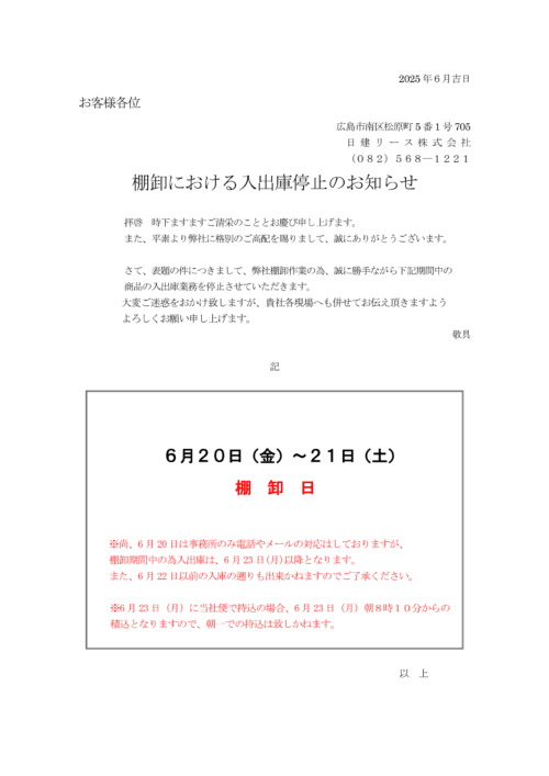 棚卸のお知らせ